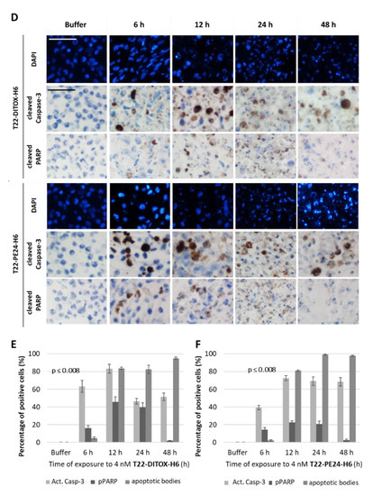 Moreover, apoptosis markers such as nuclear condensation, according to the results of DAPI staining, and expression of apoptotic markers (cleaved caspase-3 and its cleavage product, and proteolyzed PARP), increase at 6 h after exposure to both nanoparticles, being this effect higher in cells treated with T22-DITOX-H6 (Figure 2D–F). Positive cells for all these markers were determined using QuPath software and statistically significant differences were found when comparing all treated samples at different timepoints, compared to control cells (Figure 2E,F).