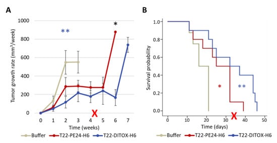 To assess the effect of each nanotoxin on tumor growth and mice survival, animals were recruited when tumors reached 30–70 mm3. They were randomized into three groups (n = 10/group), receiving either 10 µg T22-DITOX-H6, 10 µg T22-PE24-H6 or carbonate buffer as a control, three times a week for a maximum of 15 doses (Figure S2).