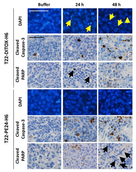 T22-DITOX-H6 and T22-PE24-H6 nanotoxin treatment activates apoptosis in vivo in a subcutaneous tumor generated in the CXCR4+ AN3CA EC model. Mice were treated with a single bolus of either buffer, 100 µg T22-DITOX-H6 or 30 µg T22-PE24-H6. Tumor sections were stained with fluorescent DAPI, showing DNA condensation in apoptotic bodies, and IHC staining for markers of cleaved caspase-3 and proteolyzed PARP. Arrows indicate positive cells. Bar: 50 μm.