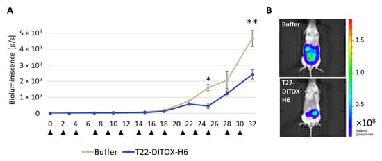 T22-DITOX-H6 repeated dosage reduces whole-body bioluminescence emission in an orthotopic CXCR4+ AN3CA EC model. (A) Total bioluminescence intensity (BLI) registered over time in mice treated with buffer or T22-DITOX-H6 (n = 9 animals per group). Data are reported as mean ± SEM. Asterisks indicate significant differences in emitted BLI between the compared groups using the Mann–Whitney U test (* p < 0.05; ** p < 0.01). Arrows indicate treatment administration. (B) Representative images of the control and nanotoxin-treated mice as registered by IVIS Spectrum at day 32.