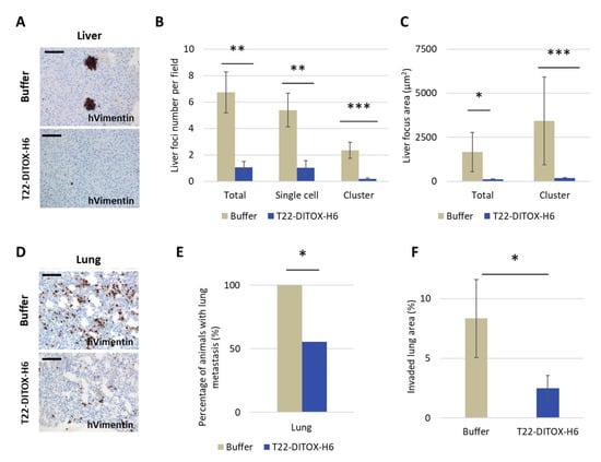 Metastatic foci development in the liver and lung was inhibited by T22-DITOX-H6 treatment, as measured by human vimentin IHC on tissue slides. We found that 33.3% of nanotoxin-treated mice were free of liver and lung metastasis. Interestingly, a dramatic decrease was found in EC metastatic foci number and foci area in the liver (Figure 7A–C; Table S1). Regarding lung metastasis, there was a significant decrease in the percentage of mice showing tumor cells in lung, from 100% in the control group to 55.56% in the T22-DITOX-H6-treated group. In addition, nanotoxin-treated mice showing had significantly lower EC cancer cell dissemination in lung tissue than the control group (Figure 7D–F; Table S1).