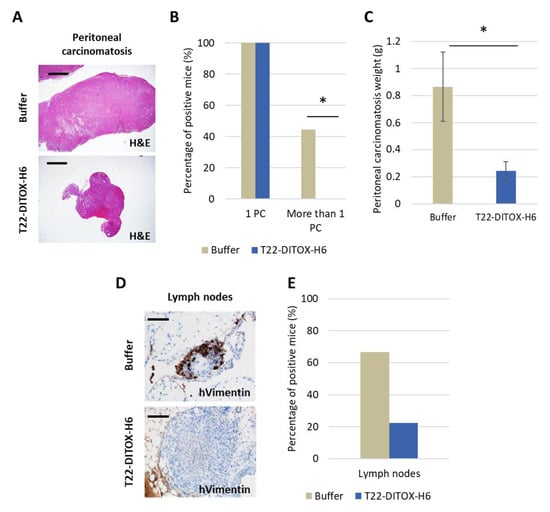 Even though all mice showed macroscopic peritoneal implants, significant differences were found in control and treated animals (Figure 8A–C; Table S1). T22-DITOX-H6 significantly inhibited their growth regarding both the number and total weight of the peritoneal metastases. Nevertheless, differences in the percentage of mice in each group developing lymph nodes metastasis did not reach significance (Figure 8D,E).