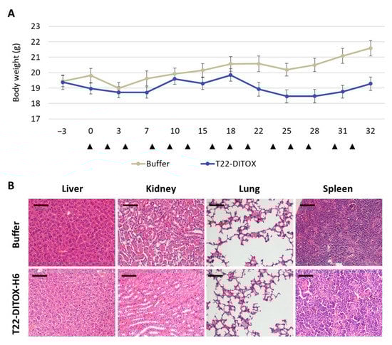 T22-DITOX-H6 and T22-PE24-H6 did not induce systemic toxicity in the CXCR4+ AN3CA subcutaneous EC model. (A) Body weight evolution over time did not show differences between control and nanotoxin-treated mice. The red cross indicates the end of treatment administration. (B) Hematoxylin-eosin staining of non-tumor organs 48 h after the last nanotoxin administration showed normal tissue architecture and, therefore, a lack of histological alterations and lack of protein deposition. Bar: 100 µm.