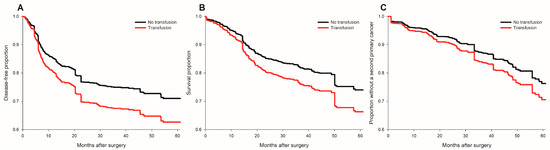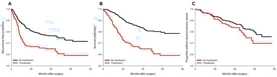 Survival plots of cancer recurrence, all-cause mortality, and occurrence of second primary cancers for transfused and non-transfused patients before IPTW. (A) cancer recurrence; (B) all-cause mortality; (C) occurrence of a second primary cancer. No transfusion group (black line); transfusion group (red line).