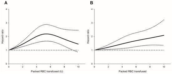 The packed red blood cell transfusion showed a dose-dependent risk for (A) cancer recurrence; (B) all-cause mortality. Hazard ratio (solid line); 95% confidence intervals (dotted lines); a reference of hazard ratio = 1 (dashed line).