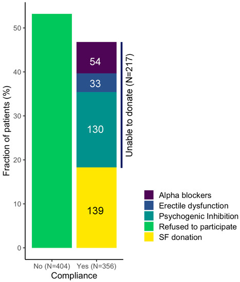 Compliance to the study and semen self-sampling yield. The bar plot shows the percentage of patients that declined (left) or accepted (right) to participate in the study. Among the patients who accepted, the percentage of patients that were able or not to provide a sample of ejaculate is indicated, with the reason for the lack of donation. Numbers of patients are also reported.