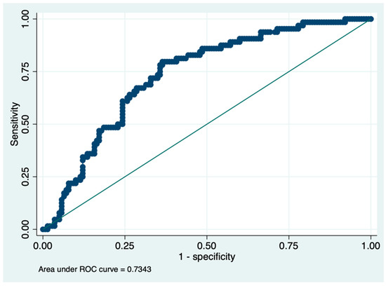 Before addressing whether the liquid biopsy of SF is a valid and clinically useful option, we evaluated the patients’ willingness to participate and provide a SF sample. From July 2017 to December 2021, 760 patients with localized PCa, who were scheduled for whole gland treatment (RP or radiotherapy), were proposed to enter the study. Patients’ demographic and clinical characteristics are shown in Table 2. PCa characteristics are described by multiple classification systems, including: (1) the PIRADS (Prostate Imaging Reporting And Data System) score, which is based on multiparametric MRI findings and ranges from 1 to 5, where higher scores indicate a progressively increased probability of having a clinically significant PCa; (2) the ISUP histopathological grading, which defines 5 grade groups based on GS (ISUP 1: GS ≤ 6; ISUP 2: GS 3 + 4; ISUP 3: GS 4 + 3; ISUP 4: GS 8; ISUP 5: GS ≥ 9); (3) the pathological Tumor, Node, Metastasis (pTNM) staging, which gives an idea of the anatomical extension of the tumor within the prostate (pT2, PCa confined within the prostate, pT3, extracapsular extension or seminal vesicles invasion) and in the regional lymph nodes (pN); and (4) the positive margins, referring to the presence/absence of cancer cells at the edge of the tissue removed by surgery. In the entire cohort, mean age was 65.5 (±SD 8.1) years, median pre-biopsy PSA was 7.01 ng/mL (IQR 5.1–11.6). Family history (limited to father and brothers) was found in 85 (11%) patients, mpMRI was performed in 461 patients before biopsy. The median biopsy ISUP was 2 (IQR 1–3) and the median ISUP at the final pathological report was 2 (IQR 2–3). RP was performed in 279 patients, while 481 opted for alternative non-surgical treatments. The PIRADS score was determined in 53.9% of the patients. Among the patients with available data, 4.3% had a PIRADS score of 1, 0.1% had a score of 2, 12.5% had a score of 3, 26.4% had a score of 4, and 10.5% had a score of 5. The median prostate volume at the time of MRI was 50 cc, with a IQR of 36–70 cc. Considering only the patients who underwent surgery (279), at the final histological report, most patients had an ISUP grade of 2 (127, 45.5%), followed by grades 3 (78, 28.0%) and 5 (36, 12.9%). A smaller percentage of patients had grades 1 (16, 5.7%) and 4 (22, 7.9%). No statistically significant difference was recorded between biopsy ISUP and ISUP at the final histological report (p > 0.05). The predominant pT stage was pT2c (148, 53.0%), while stages pT3a and pT3b accounted for 25.4% (71) and 10.4% (29) of patients, respectively. Stage pT2a and pT2b were less frequent (10.4% and 0.7%, respectively). Regarding lymph node involvement, most patients (251, 90.0%) had no evidence of pN involvement (pN0), while 10.0% (28) had evidence of PCa having spread to local (pelvic) lymph nodes (pN1). Similarly, 81.7% (228) of the patients had negative margins (R0) and 18.3% (51) had positive margins (R1). The percentage of tumor involvement varied across patients, with a median value of 15% and a IQR of 8–20%. Of 760 patients, 404 (53.15%) declined to participate (Figure 1). As they did not sign any informed consent and rejected to participate to the study, no further information about the reasons why they declined to collect SF is available. Among the 356 patients who accepted to participate, 139 (39%) were able to collect a SF sample (Figure 1). Considering 217 patients who did not collected the SF, 130 (59.9%) reported that failure was due to psychogenic inhibition at the time of masturbation, 33 (15.2%) suffered from erectile dysfunction, and 54 (24.9%) had retrograde ejaculation due to alpha blocker treatment. Considering the total amount of patients who were able to collect semen (139), in most of the cases (100, 72%), urine was also collected. Table 2 also shows the baseline differences between patients who decided to participate and those who declined to participate in the project. Pathological data from patients who did not consent to donate their SF, but underwent RP, were retrospectively reviewed and used for Table 2. As shown in Table 2, patients who decided to participate had higher total PSA level, PIRADS at mpMRI, higher percentage of tumor and ISUP at the final histological report, and a lower prostate volume in a statistically significant manner. Moreover, when stratified according to the ability of semen collection, as illustrated in Table 3, only age and prostate volume demonstrated statistically significant differences between the two groups (p < 0.001). Finally, we fitted a logistic regression model to test the independent predictors of semen collection. In the univariate and multivariate analysis, age (OR 0.95; CI 0.91–1.0; p < 0.05) and lower prostate volume (OR 0.97; CI 0.95–0.98; p < 0.001) were the only independent predictors of semen collection (Table 4), with an area under the receiver operator of 0.73 (Figure 2).