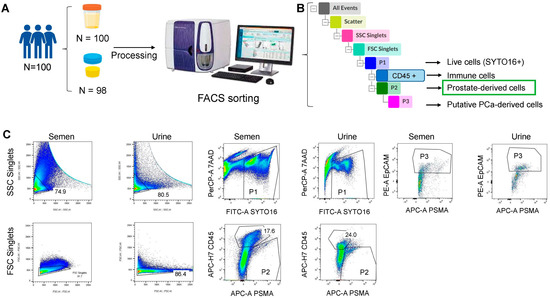 At the time of admission to the hospital, usually the day before surgery or radiotherapy, each participating patient was asked to provide a SF and a post-ejaculation urine sample. Patients were invited to collect the seminal and urine samples at home, using two different sterile collection vessels provided by the lab or pharmacy, and return the samples within 2 h from collection. They should not have sexual activity for 2 to 5 days before collecting the sample. All patients were instructed to collect the sample by cleaning the head of the penis with wet, soapy wipes or cotton balls and drying the glans well before collecting the sample. The sample was obtained by self-masturbation, and not during intercourse. The volumes of SF samples ranged between 0.1 and 5 mL (median 1.5 mL). The patients were also asked to collect a urine sample after ejaculation. The volumes of urine samples ranged between 3 and 30 mL (median 25.5 mL). Both semen and urine samples were centrifuged at 450× g at room temperature for 10 min to separate the cellular component from the seminal plasma. In case the SF was particularly rich in sperms, the sample was subjected to a step of liquefaction at 37 °C with gentle mixing for 30 min before centrifugation. The cellular component was further processed by FACS to enrich for prostate-derived circulating cells.