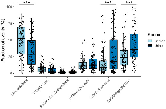 Enumeration of cell subpopulations analyzed by FACS from semen and urine. The number of cells is expressed as the percentage of events recorded in each gate out of the total or of the gated-parent population. The boxplots show the comparison between semen (blue) and urine (green) subpopulations in the analyzed patients. Significance was calculated by the using Mann–Whitney statistical test (*** p-value < 0.001). The data used to generate the Figure are available in File S1.