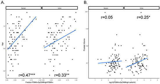 Correlation of selected clinical parameters with cancer-derived cells isolated from semen and urine. (A) Patient age positively correlates with the fraction of EpCAMhigh cells over prostate-enriched cells (PSMA+) in both semen and urine. (B) Prostate volume positively correlates with the concentration (cells/mL) of EpCAMhigh cells in urine only. Significance was calculated by using one-way ANOVA test (* p-value < 0.05, ** p-value < 0.01, *** p-value < 0.001). The data used to generate the Figure are available in File S2.