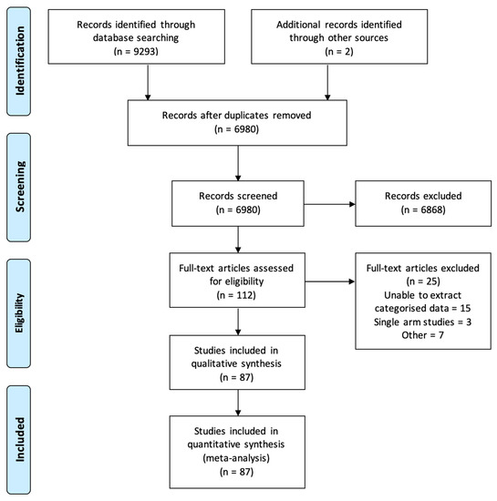A total of 9295 articles were identified from the online literature search. A total of 112 studies were selected for full-text review, of which 25 were excluded, as they were either a single-arm study (without control group), or they did not report relevant information (e.g., named bacteria). Final analysis included 87 studies: 56 studies assessing gastric adenocarcinoma [3,16,20,21,22,23,24,25,26,27,28,29,30,31,32,33,34,35,36,37,38,39,40,41,42,43,44,45,46,47,48] and 42 studies assessing oesophageal carcinoma (adenocarcinoma and/or squamous cell carcinoma) [12,35,38,49,50,51,52,53,54,55,56,57,58,59,60,61,62] (Figure 1). Two studies reported data from both oesophageal and gastric cancers [35,38].