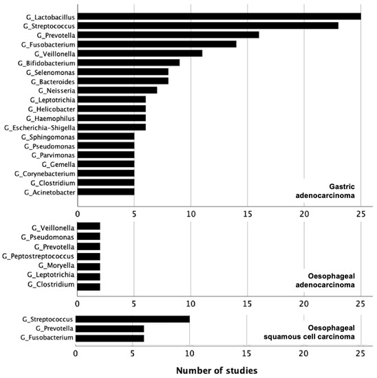 A limited number of studies with variable methodologies meant that fewer trends were observed in the oesophageal adenocarcinoma microbiome. Of 14 studies, only three studies identified the same seven genera, Veillonella, Pseudomonas, Prevotella, Peprostreptococcus, Moryella, Leptotrichia and Clostridium [58,61,91]. No bacterial changes were consistently observed in more than two studies.