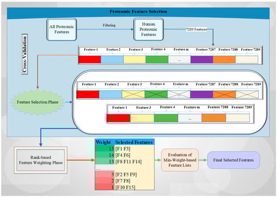 Initially, all proteomic values with human or non-human characteristics are filtered to select only human-based proteomic features, followed by the designation of the sample (acquired pre- or post-CRT) being directed into the FS phase using a cross-validation technique. Every selected feature set identified by the two different feature selection methods utilized for each fold is saved, and their counts are increased by using the corresponding FS method weights (i.e., rank-based approach). Subsequently, the minimum weight-based feature list is evaluated with all of the different weight values. In the last stage, the final selected feature list is obtained by assessing all the weight values to identify those with the highest accuracy rate.