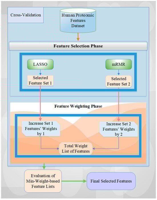 The detailed algorithmic view of the proposed architecture is illustrated in Figure 2, which shows the two FS methods, LASSO and mRMR. These methods choose features for every fold of the cross-validation of the human features-based proteomic dataset. Then, the weights of the selected features in each set for each fold are increased according to the rank-based importance level of the chosen FS methods (i.e., LASSO features are increased by one, and mRMR features are increased by two according to their performance results in terms of accuracy rate, see Table 1). For example, if the same feature is selected by both LASSO and mRMR FS methods for each fold of 5-fold cross-validation, the weight of this feature will be 15 (i.e., the summing of assigning 2 as a weight value with mRMR and of 1 as a weight value with LASSO for 5-fold cross-validation). This value is the maximum weight value for 5-fold cross-validation. We obtain a 0 value for the minimum weight value of the selected feature in a similar manner if the feature is not chosen by any FS method for each iteration. However, we should identify this value at least as 1 to use all selected features of all iterations of cross-validation for the experimental results.