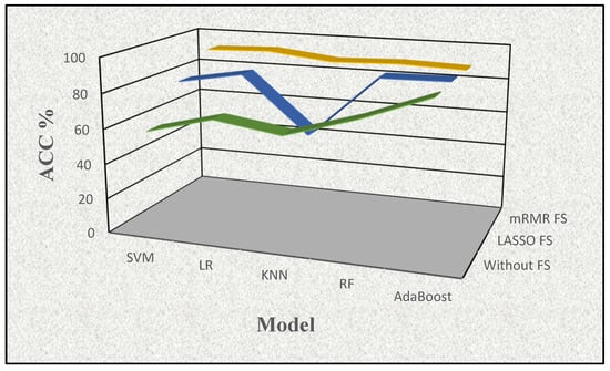 The visualization of the effects of the feature selection procedures with accuracy (ACC%) determined by a supervised learning method in conjunction with the feature selection approach (mRMR FS (yellow), LASSO FS (blue), and no FS (green)).