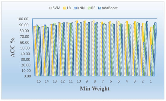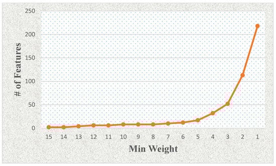After the FS and feature weighting stages, total weights with the corresponding feature lists are obtained, and the evaluation of minimum weight-based feature lists and selection of final features are performed for all weight values. To better explain this process, we can give an example. If we identify the minimum weight as 13 for our study, we can use the selected features with the weight values of 13, 14, and 15 (e.g., [F1, F3, F4, F6, F8, F11, F14]) as the final selected feature set according to Figure 1. These weight values are evaluated according to their performance results in terms of accuracy rate. We identify the min weight value with the highest accuracy rate and the minimum selected number of features for all values set in the dataset in this study.