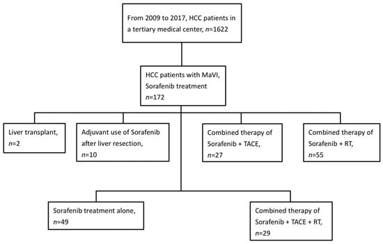 The study was performed as a retrospective investigation in a tertiary medical center. The medical records of patients with advanced-stage HCC with MaVI who received sorafenib were traced from March 2009 to October 2017. During that time, a multidisciplinary team discussed most of the cases regarding therapeutic plans. This team comprised medical oncologists, radiation oncologists, radiologists, pathologists, hepatologists, and hepatobiliary surgeons.
