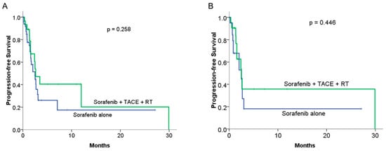 Comparison of median progression-free survival (PFS) between sorafenib alone and combined therapy groups: (A) KM curves in the original cohort study (n = 78): median progression-free survival was 2.5 months and 2.63 months for the sorafenib alone and combined therapy groups, respectively (p = 0.258). (B) The KM curves of PFS in the PSM groups (n = 21 to 21): the median PFS was 2.5 months and 2.56 months for the sorafenib alone and combined therapy groups, respectively (p = 0.446).