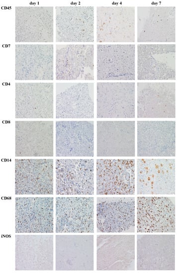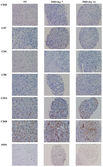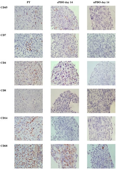 In contrast to nPDOs, ePDOs were not affected by significant alterations in TME expression patterns until day 21 when comparing to PT (CD45+, CD4+, CD8+, CD7+ and CD68+ cells). Interestingly, iNOS+, CD14+ and CD163+ cells were practically not detectable in ePDOs after 21 days of culture, despite being present in the corresponding PT. Data are shown in Figure 6. An example of a representative immunohistochemical staining for is provided in Figure 7. Overall, ePDOs were able to reflect TME expression patterns significantly better than nPDOs.