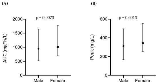 Regarding the treosulfan pharmacokinetics assessed via mass spectrometry, we observed high interpatient variability, which is in line with our previous AML data [20]. It is not fully clear whether treosulfan distribution shows high interpatient variability at a steady state (Vss) due to differences in total body water percentage or age and whether treosulfan AUC correlates with toxicity [20,30,31,32]. Moreover, the treosulfan AUC and peak values were higher in female patients (p = 0.001), most probably due to lower glomerular filtration and total body water content [33]. The higher AUC and peak values showed a positive but weak correlation with longer hospitalizations (r = 0.39, p = 0.0001). However, prospective studies would be required to assess whether a dose modification could be safely enacted in female patients without compromising drug efficacy. Moreover, remission status post-HDCT and ASCT showed no correlation with treosulfan pharmacokinetics.