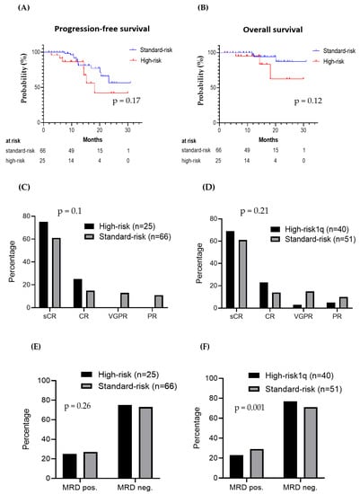 We compared PFS, OS, remission status, and minimal residual disease (MRD) via flow cytometry after HDCT and ASCT in patients with standard- vs. high-risk cytogenetics. The results of the cytogenetic analysis were available for 91 patients (79%); the remaining 24 patients could not be included in this analysis. Patients with del(17p), translocation t(4;14), and translocation t(14;16) were classified as high-risk. In our cohort, 66 patients had standard-risk cytogenetics and 25 high-risk cytogenetics. We observed a statistically nonsignificant trend towards better PFS (HR: 0.48, p = 0.17) and OS (HR: 0.21, p = 0.12) for those patients with standard-risk cytogenetics (Figure 3A,B). Unequal sample sizes could have potentially contributed to nonsignificant p values. In an additional analysis, 15 patients with ≥3 copies of 1q21 (1q21+) were reclassified within the “high-risk1q” group (n = 40) and were compared to the rest of the standard-risk patients (n = 51). We observed no significant differences in the response rates and MRD rates between both stratifications (Figure 3C–F). Similarly, the sCR rates were 60.7% vs. 66.7% vs. 75.9%, and the MRD negativity rates were 79.3% vs. 76.5% vs. 67.9% for R-ISS stage I, II, and III, respectively (Figure 3G,H).