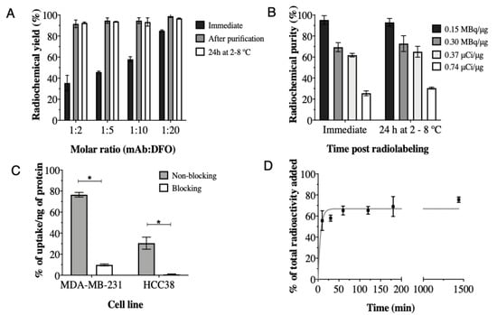 The optimal conjugation molar ratio (mAb:DFO) found was 1:20, which provided the highest radiochemical yield without additional purification (Figure 1A); therefore, this molar ratio was used for immunoreactivity studies. Chemistry optimization increased the radiochemical purity from 85.05% ± 0.74% (Figure 1A; 1:20; immediate) to 98.88% ± 1.3% (without additional purification) and showed stability >95% after 24 h at 2–8 °C (96.73% ± 0.49%) (Figure 1B). The specific activity of 0.15 MBq/µg was achieved with conservation of immunoreactivity (110.3% ± 29.8%).
