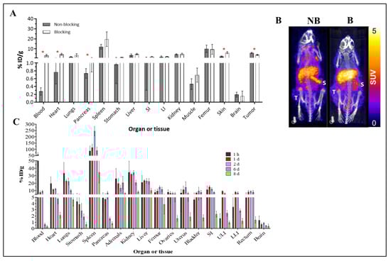 [89Zr]-Atezolizumab showed tumor uptake in MDA-MB-231 xenograft tumors with a specific binding, which was partially blocked by co-injection of non-radioactive antibody (2.5 mg of non-radioactive antibody; 25 µg of radioactive antibody; Figure 2A). Figure 2B shows representative images of mice undergoing blocking vs. non-blocking studies with decreased tumor uptake when blocked, which is consistent with biodistribution data. Significant increases in [89Zr]-Atezolizumab uptake are observed in the blood, heart, pancreas, skin, and tumor in mice that received a blocking dose prior to [89Zr]-Atezolizumab imaging (Figure 2C).