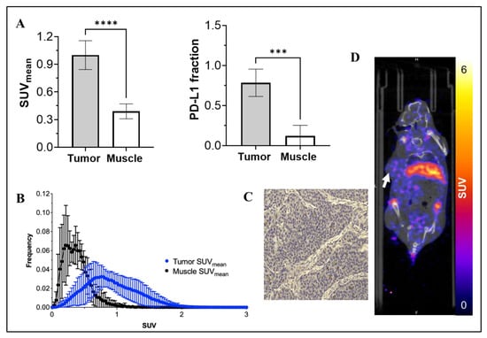 SUVmean of [89Zr]-Atezolizumab uptake in tumor and muscle, and a fraction of PD-L1 expressing cells in tumor and muscle (A); Voxel histogram analysis of tumor and muscle (B); Representative IHC slide of tumor stained with anti-PD-L1 antibody (C). More IHC images in larger size are available in the Supplemental Methods section; and Representative PET-CT imaging of [89Zr]-Atezolizumab in NSG mice transplanted with TNBC PDX BCM 3936 (D). White arrow denotes the location of the tumor xenograft. Results expressed in Mean ± SD; N = 5; *** p = 0.001; **** p < 0.0001.