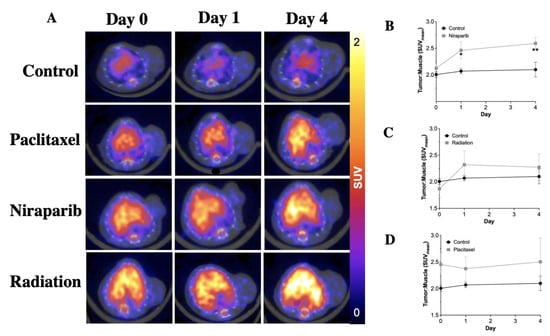 Figure 4 shows the results obtained for the modulation study, where [89Zr]-Atezolizumab was injected into the TNBC PDX model, imaged at baseline, and treated with paclitaxel, niraparib, or radiation. A significant increase in tumor:muscle SUVmean 1 and 4 days after therapy (following baseline imaging on day 0) with niraparib compared to the control group (2.069 ± 0.101 SUVmean vs. 2.461 ± 0.320 SUVmean, for day 1 tumor and 2.098 ± 0.276 SUVmean vs. 2.591 ± 0.224 SUVmean, for day 4; p ≤ 0.05; N = 5); however, paclitaxel and radiation only induced a slight upregulation (p > 0.05) of PD-L1 in the tumor. IHC Quantification of PD-L1 revealed that although there was no difference in PD-L1 expression within the groups (p > 0.05), all treatments induced target upregulation in the tumor (56.24% ± 12.33%; 59.02% ± 8.43%; 69.56% ± 10.75% and 66.53% ± 16.24% for control, paclitaxel, niraparib, and radiation groups, respectively). Niraparib induced upregulation compared to the control, which correlates with the results obtained with [89Zr]-Atezolizumab imaging.