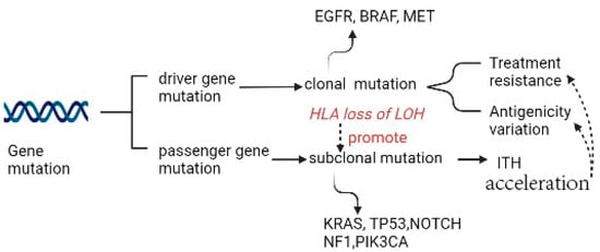 Driver mutation in non-small cell lung cancer (NSCLC) occurs in EGFR, BRAF, and MET and is exclusively clonal and early, whereas subclonal driver mutation can occur in most instances, such as in PIK3CA, NF1, KRAS, TP53, and NOTCH family members. Two types of driver mutations assume distinct duties in tumor generation and therapies. When certainly targetable, an exclusively clonal driver mutation can be the direct result of targetable treatment across multiple positions of disease, subclonal driver mutation always appears subclonally or is absent in most regions. The latter can be clonal in a single region, where a large fraction of subclonal driver mutations accumulate [2,3] (Figure 1). In LC, a high subclonal mutation burden has been reported to be closely associated with human leukocyte antigen (HLA) loss of heterozygosity (LOH).