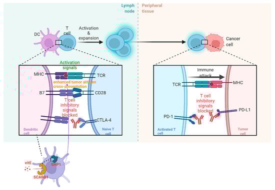 The acknowledgment of the diversity of TIME (part of TME) due to TME factors and immunological ITH is of great significance so that new therapeutic targets can be found and their roles in patients receiving immune check-point blockade (ICB) therapy can be validated. The therapy is deemed to be a hindrance to the co-activities of the receptor and/or the ligand, such as cytotoxic T lymphocyte-associated antigen-4 (CTLA-4) and programmed cell death protein (PD-1). Recently, it has been found that vitamin E(VitE) can increase the antitumor efficacy of immune check-point therapy (ICT) (Figure 2). In this way, ITH occurs in TIME when protein tyrosine phosphatase SHP1 in dendritic cells (DCs) are inhibited. Then, DCs can enhance different levels of cross-presentation of tumor antigens, and different numbers of extracellular vesicles of DCs can trigger systemic antigen-specific T cell antitumor immunity in various degrees (Figure 2) [32].