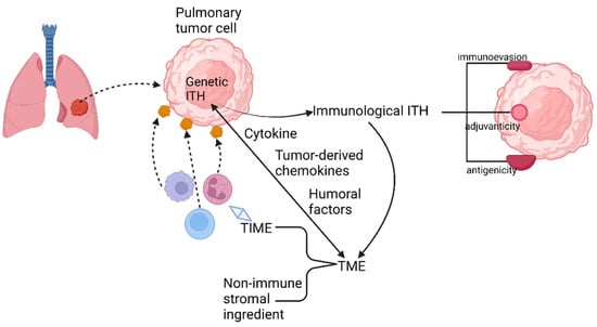 From the perspective of therapy, the alteration of behavior correlated with the immunity of malignant pulmonary tumor should be seriously focused on. The characteristic immune response of pulmonary tumors can be recognized from the immunological ITH and tumor microenvironment (TME) ITH. Many elements in pulmonary TME vary both spatially and temporally, constructing a gigantic net of therapeutic schedules and pulmonary tumor ITH. In addition to the non-immune part, tumor immune microenvironment (TIME) ITH forms a landscape continuum based on spatiotemporal dimensionality, presented by affected immune cell function and immune factors. Multiple factors are secreted by pulmonary tumor cells and cells engaged in immune response progression.