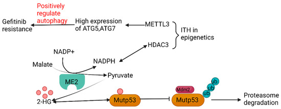 The latest survey has revealed that variation in metabolic state can be an indispensable source of genetic ITH. Malic enzymes (ME), as sources of NADPH, accelerate the combination of NADPH and histone deacetylases 3 (HDAC3) in cancer cells and adipocytes, and influence the level of epigenetics. Additionally, ME2 can enhance the stability of mutant p53 (mutp53) by increasing the generation of 2-hydroxyglutaric acid (2-HG), through which the degree of ubiquitination and degradation of mutp53 can be decreased, mediated by murine double mimute2 (mdm2) [41]. Moreover, ITH in epigenetics also has a tight connection with metabolic ITH, in addition to the crucial role performed by HDAC3. Another enzyme called methyltransferase-like 3 (METTL3) can regulate the level of methylation of mRNA as a kind of methylase. The different expression of METTL3 increases the levels of expression of critical genes regulating the autophagy pathway, such as autophagy-related gene -5 (ATG-5) and ATG-7, and has proven that alterations in autophagy, mediated by METTL3, can present different degrees of gefitinib resistance in NSCLC, the mechanism of which is possibly connected tightly with temporal ITH (Figure 4) [42]. It has been proved that autophagy induction following hypoxia has been proposed as a survival mechanism driving tumor progression [43].