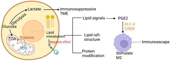 Tumor extrinsic factors can also perform a crucial role in triggering the profound change in the structure of TIME. For example, the non-immune stromal ingredient of TME can influence immune components. In NSCLC, BRAFV600E promotes the generation of interleukin (IL), such as IL-1α and IL-1β, hence repressing the recognition and killing capacity of tumor-specific CTLs, partially through the upregulation of PD-1 ligands, PD-L1, and PD-L2, and via secretion of cyclooxygenase (COX-2). A similar mechanism was also found in melanoma [36].