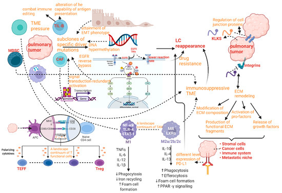 Generally, in the pulmonary neoplastic microenvironment, principal alterations of cell constituent included reduction in CTLs and DCs, collection of TREG cells, expansion of CAFs, intensified exhaustion of T cells, accumulation of immunosuppressive cells compartments, such as MDSCs and specific CAF subsets [87].