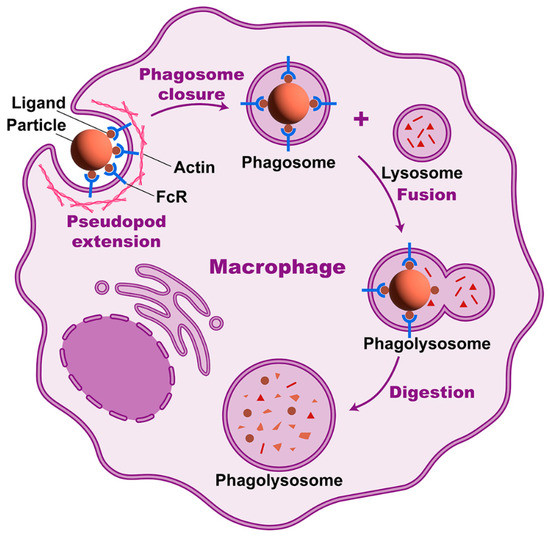 It is likely that professional phagocytes possess a greater phagocytic ability than nonprofessional phagocytes due to the presence of specific receptors that enhance the range of particles and phagocytic rate [16]. Macrophages recognize phagocyte-specific antigens and ligands through various receptors, such as complement receptors (CRs) and Fc receptors for IgG (FcγRs) [69,70]. When exposed to interferon-gamma (IFN-γ) and LPS, M1 macrophages express opsonic receptors, such as FcγRIII (CD16), but M2 macrophages express non-opsonic receptors more frequently (e.g., mannose receptors and scavenger receptors) [71].