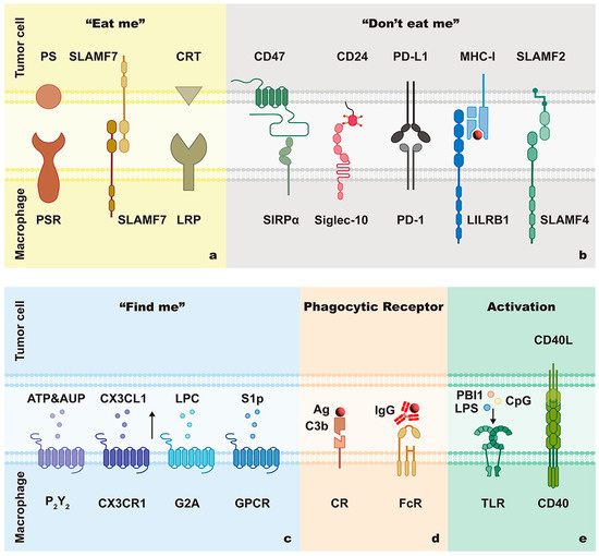 Interactions between macrophages and tumor cells in FcγR-mediated phagocytosis. The phagocytosis of macrophages is related to phagocytic signals, phagocytic receptors, and macrophage activators. Phagocytic signals, including “eat me” signals (a), “don’t eat me” signals (b), and “find me” signals (c), function as phagocytosis switches. Macrophages recognize phagocyte-specific antigens and ligands through various phagocytic receptors (d). The capability of macrophage-mediated phagocytosis is influenced by macrophage activation (e).