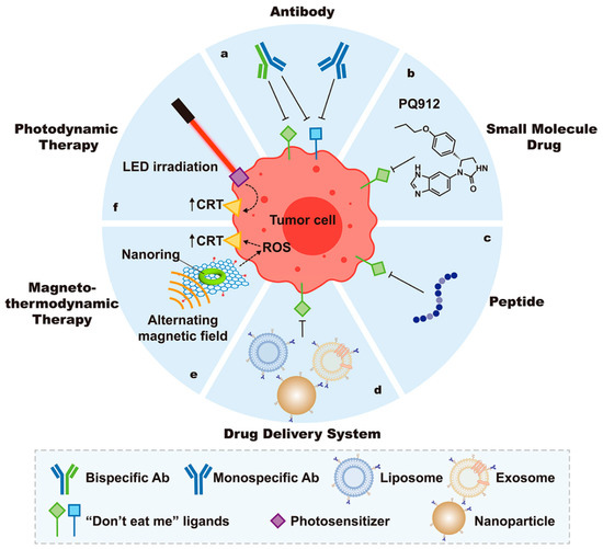 Strategies for strengthening macrophage-mediated phagocytosis based on phagocytosis signal regulation. To promote macrophage-mediated phagocytosis, “don’t eat me” signals are blocked using monospecific or bispecific antibodies (a), small molecule drugs (b), and peptides (c). Nanomaterials such as liposomes, exosomes, and nanoparticles are used as drug delivery systems (d) to carry therapeutics that encourage macrophage phagocytosis by blocking “don’t eat me” signals. (e) In magneto thermodynamic therapy, an increased level of ROS induces expression of the “eat me” signal CRT on tumor cells, which enhances macrophage-mediated phagocytosis. (f) Under LED irradiation, photosensitizers increase CRT on the surface of tumor cells, resulting in macrophage-mediated phagocytosis of tumor cells.