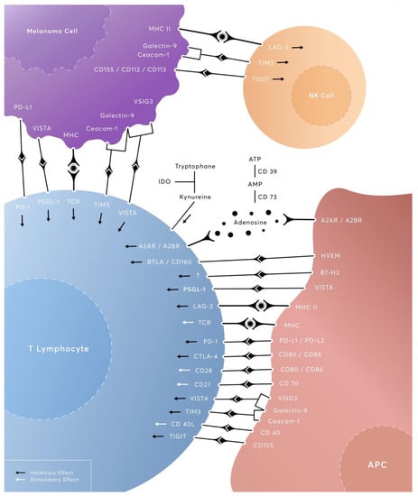 An overview of the complex checkpoint-mediated crosstalk between melanoma cells and immune effector cells.