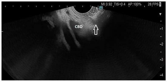 - Schaefer, M.; Albouys, J.; Legros, R.; Sautereau, D.; Charissoux, A.; Lepetit, H.; Jacques, J. Endoscopic ultrasound-guided choledochoduodenostomy (EUS-CDS) using electrocautery-enhanced lumen-apposing metal stent: The easiest way to perform EUS-CDS? Endoscopy 2019, 51, E219–E220. [Google Scholar] [CrossRef]