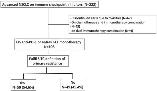 Using the above definition, we performed a retrospective analysis of advanced NSCLC patients who received ICI monotherapy across two tertiary institutions in Singapore to identify factors predictive of primary resistance to ICI. While the molecular mechanisms of resistance to ICIs have been studied and described extensively [12,20,21], studies on clinical factors predictive of primary resistance are lacking. In this study, we included advanced NSCLC patients on ICI monotherapy only to minimize treatment heterogeneity in the study population, and remained consistent with the SITC definition of primary resistance, where only patients treated with systemic anti-PD1 or anti-PD-L1 monotherapy were included [19].