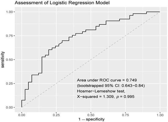 AUROC of multivariate logistic regression model. The multivariable logistic regression model exhibited acceptable discrimination (AUC = 0.749, 95% CI = 0.643–0.84). There was no evidence to reject the null hypothesis that the model fits the data (Hosmer–Lemeshow test: χ2 = 1.309, p = 0.995).