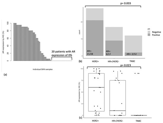 (a) AR expression (%) by IHC in breast cancer BrM (n = 57), (b) AR status (<10% or ≥10%) by breast cancer subtype, (c) AR expression (%) by breast cancer subtype.