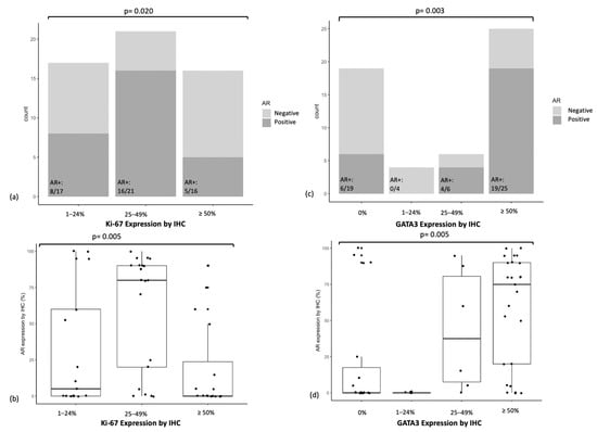 (a) AR status (<10% or ≥10%) in relation to Ki-67 expression, (b) AR expression (%) in relation to Ki-67 expression, (c) AR status (<10% or ≥10%) in relation to GATA3 expression, (d) AR expression (%) in relation to GATA3 expression.