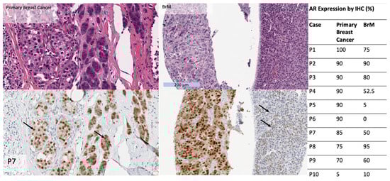 - Bergen, E.S.; Berghoff, A.S.; Steindl, A.; Rajky, O.; Mercea, P.A.; Kiesel, B.; Tendl-Schulz, K.; Bago-Horvath, Z.; Exner, R.; Fitzal, F.; et al. Androgen Receptor Is Expressed in Breast Cancer Brain Metastases. Appl. Immunohistochem. Mol. Morphol. 2021, 29, 728–733. [Google Scholar] [CrossRef] [PubMed]