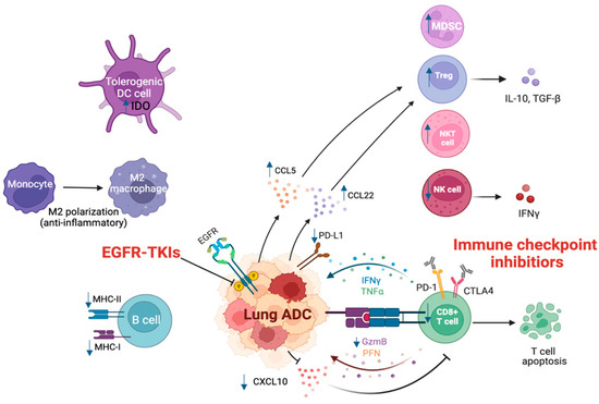 CD8+ cytotoxic T lymphocytes (CTLs) play a crucial role in the tumor immune cycle by recognizing and eliminating cancer cells. Upon activation through the engagement of TCR on CD8+ T cells with neoantigens presented by MHC-1 on APCs and target cells, followed by secondary activation signal by CD28 and CD80 co-stimulatory signals, CD8+ T cells can directly kill tumor cells by releasing cytotoxic molecules, such as perforin and granzyme B. Perforin is a cytolytic pore-forming protein which allows entry of granzyme serine protease to activate the caspase cascade and eventually induces apoptosis of target cells. However, CD8+ T cells can also have negative regulatory roles in the tumor immune cycle. For instance, they can become terminally exhausted (progenitor-exhausted), which could limit their ability to recognize and kill tumor cells, but also actively participate in tumor progression by maintaining the cancer stemness [33]. This occurs due to prolonged exposure to the tumor antigens [34] or chronic inflammation [35], or inhibitory signals released from the TIME [36]. However, a study from Nishii et al. demonstrated that CD8+ T cell responses were induced by EGFR-TKI. They showed that EGFR inhibition is a prerequisite for the subsequent ICI treatment [37].