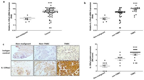 Expression of IL-13Rα2 in breast cancer tissue. (a) RT-PCR analysis of IL-13Rα2 mRNA expression in cDNA array samples (TissueScan™, Origene) derived from breast cancer (number of samples (n = 60)) and non-malignant (n = 7) tissue. Shown is the fold-change relative to mean expression in non-malignant samples (mean fold-change, cancer versus non-malignant; *** p ≤ 0.001). (b) Stratification analysis of IL-13Rα2 mRNA expression data comparing TNBC-type (n = 19) versus non-TNBC (n = 41) tumors (mean fold-change, TNBC versus non-TNBC, *** p ≤ 0.001). (c) Immunohistochemical analysis of IL-13Rα2 protein expression in breast cancer tissue array samples (US Biomax, BR1009). Shown images (at 40× magnification) are representative examples of specific staining with an anti-IL-13Rα2 antibody (sc-134363) versus a mouse IgG2a isotype control: (left panel), non-malignant tissue; (middle panel) non-TNBC tumor (ER+, stage IIa); (right panel) TNBC tumor (stage IIb). (Right Figure), scoring analysis of anti-IL-13Rα2 reactivity in non-malignant (n = 9), non-TNBC (n = 8), and TNBC (n = 21) tissue array sections (mean score, TNBC versus non-malignant, *** p ≤ 0.001).