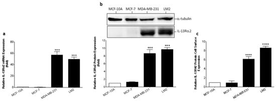 Expression of IL-13Rα2 in breast cancer cell lines. (a) RT-PCR analysis of IL-13Rα2 mRNA expression in non-malignant (MCF-10A), non-TNBC (MCF-7), and TNBC (MDA-MB-231, LM2) cells. (b) Quantification of IL-13Rα2 protein expression in representative cell lines by Western blot. For densitometry, individual band density was normalized against α-tubulin expression. The uncropped bolts are shown in Supplementary Materials File S1. (c) Cell-surface expression of IL-13Rα2 protein was measured in non-permeabilized cells by cell-based ELISA. All graphs show fold-change relative to mean expression in MCF-10A cells. Data = mean values ± SEM of three independent experiments (*** p ≤ 0.001; **** p ≤ 0.0001).