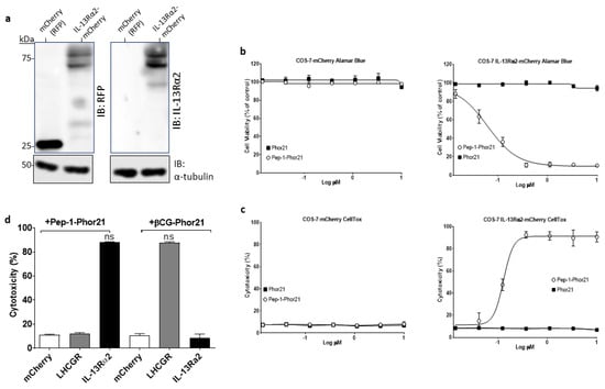 Evaluation of Pep-1-Phor21 activity. (a) Protein samples from transfected COS-7 cells expressing the red fluorescent protein (RFP) mCherry (27kDa) or IL-13Rα2-mCherry (75 kDa) were immunoblotted (IB) using either an anti-RFP or an anti-IL-13Rα2 antibody with α-tubulin detection as a loading control. The uncropped bolts are shown in Supplementary Materials File S1. (b) COS-7 cells transfected with IL-13Rα2-mCherry plasmid or empty mCherry vector were treated with Pep-1-Phor21 (O) or Phor21 (∎) at 0–10 µM for 3 h and their viability was determined by Alamar Blue assay (IC50 for Pep-1-Phor21 against IL-13Rα2-transfected cells = 0.133 µM ± 0.04). (c) CellTox assay was used to determine the cytotoxic activity of Pep-1-Phor21 against IL-13Rα2-transfected cells (IC50 = 0.130 µM ± 0.03). (d) IL-13Rα2- or LHCGR-transfected COS-7 cells were treated with 0.5 µM Pep-1-Phor21 or βCG-Phor21 for 3 h and their relative cytotoxicity was determined (versus empty vector-transfected cells). Only IL-13Rα2-transfected cells exhibited susceptibility to the cytotoxic effects of Pep-1-Phor21, whilst remaining resistant to βCG-Phor21. Data = mean value ± SEM of three independent experiments (ns = not significant).