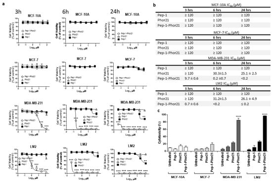 Treatment of representative breast cancer cell lines with Pep-1-Phor21. (a) Dose-dependent effect of Pep-1-Phor21 (O), Pep-1 (■), or Phor21 (∆) on the viability of non-tumorigenic (MCF-10A), non-TNBC (MCF-7), and TNBC cells (MDA-MB 231, LM2). Cells were treated with different concentrations of Pep-1-Phor21 (effective concentration range = 0–120 µM, a 5-fold serial dilution) and their viability was assessed after 3 h, 6 h, or 24 h of the treatment by Alamar Blue assay. (b) The IC50 of peptides for various cell lines for different incubation times. (c) The cytotoxic effect of individual peptides on cell lines was also assessed by CellTox assay. MCF-10A and MCF-7 cells were treated for 3 h with 120 µM Pep-1-Phor21 (maximum concentration used in the dose-response analysis, Alamar Blue, Figure 4a). MDA-MB 231 and LM2 cells were treated with Pep-1-Phor21 at 24 µM (maximal effective concentration against LM2, as determined in dose-response analysis, Alamar Blue, Figure 4a). Pep-1-Phor21 had a significant cytotoxic effect only against IL-13Rα2-expressing TNBC cells (MDA-MB-231, LM2; relative cytotoxicity = 85.2% ± 5.4 and 96.9% ± 0.38, respectively, versus non-treated cells). Data = mean value ± SEM of three independent experiments (* p ≤ 0.05; ** p ≤ 0.01; *** p ≤ 0.001; **** p ≤ 0.0001).